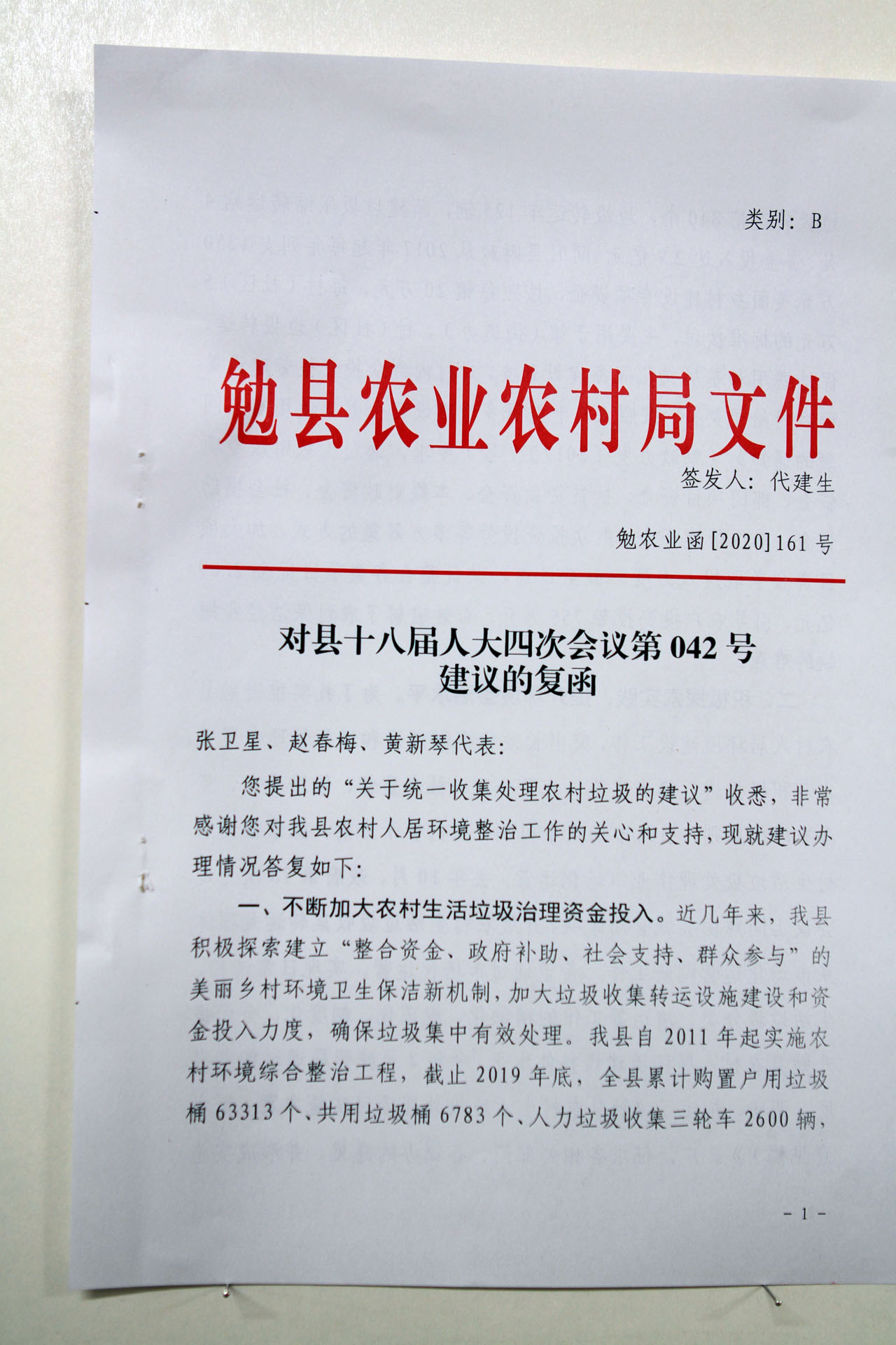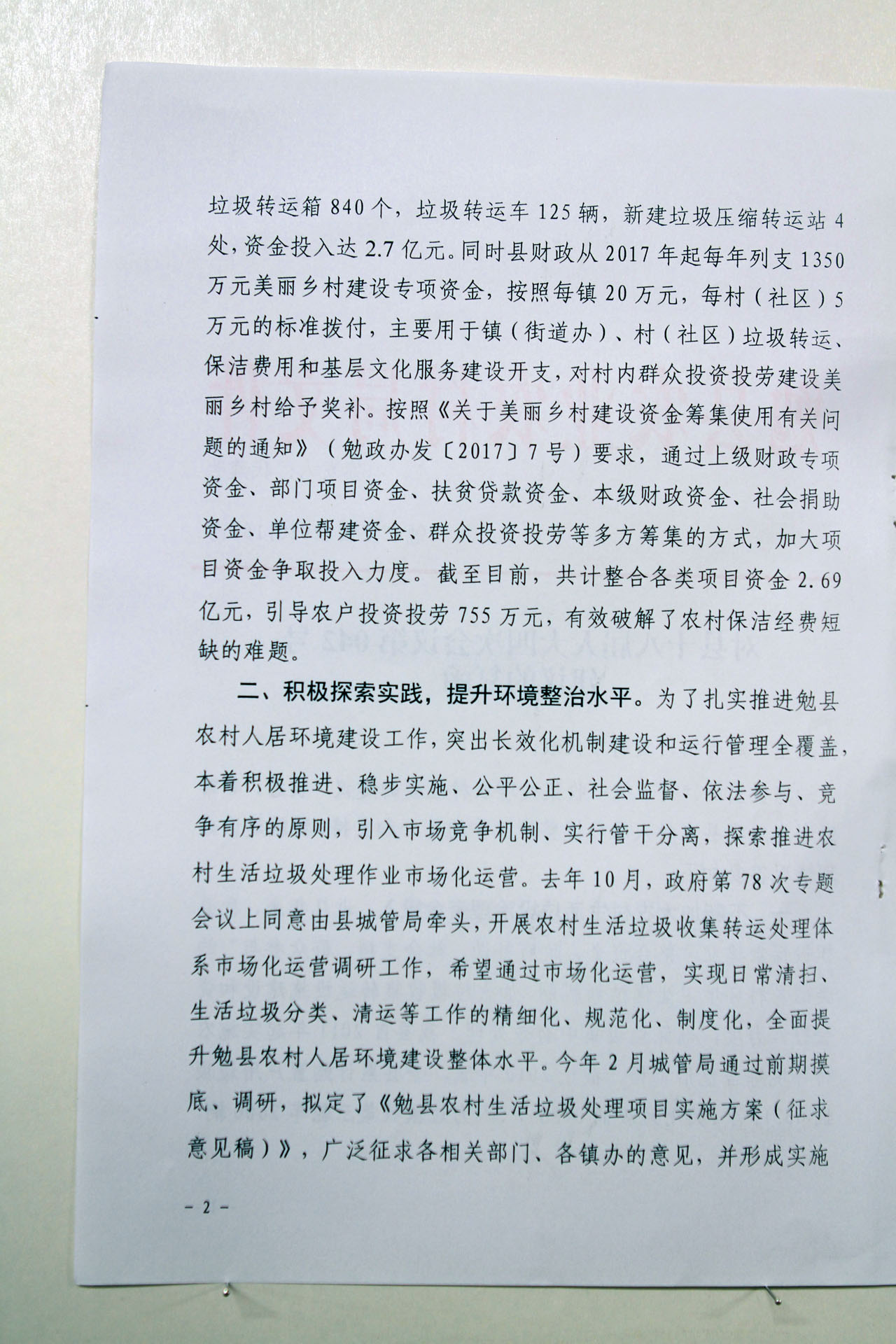 建 议:将垃圾收集清运集中处理列入县财政预算,以政府购买服务方式,打包采购1-3家有资质的企业,对全县各镇各村垃圾进行统一分类收集,清运,集中处理。
