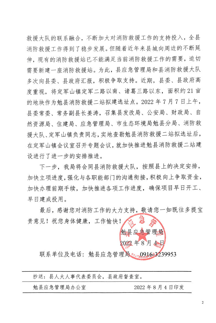 建 ⠂ 议:通过对勉县全年火灾发生地的调研,以及遵循“打早、打小、灭初期”的火灾扑救原则,并且兼顾消防救援站的合理分布。根据《汉中市“十四五”消防救援事业发展规划》要求,建议在江南片区新建一座消防救援站,主要承担江南片区的灭火战斗及应急救援任务。同时加强对建成的市政消火栓的维护保养。