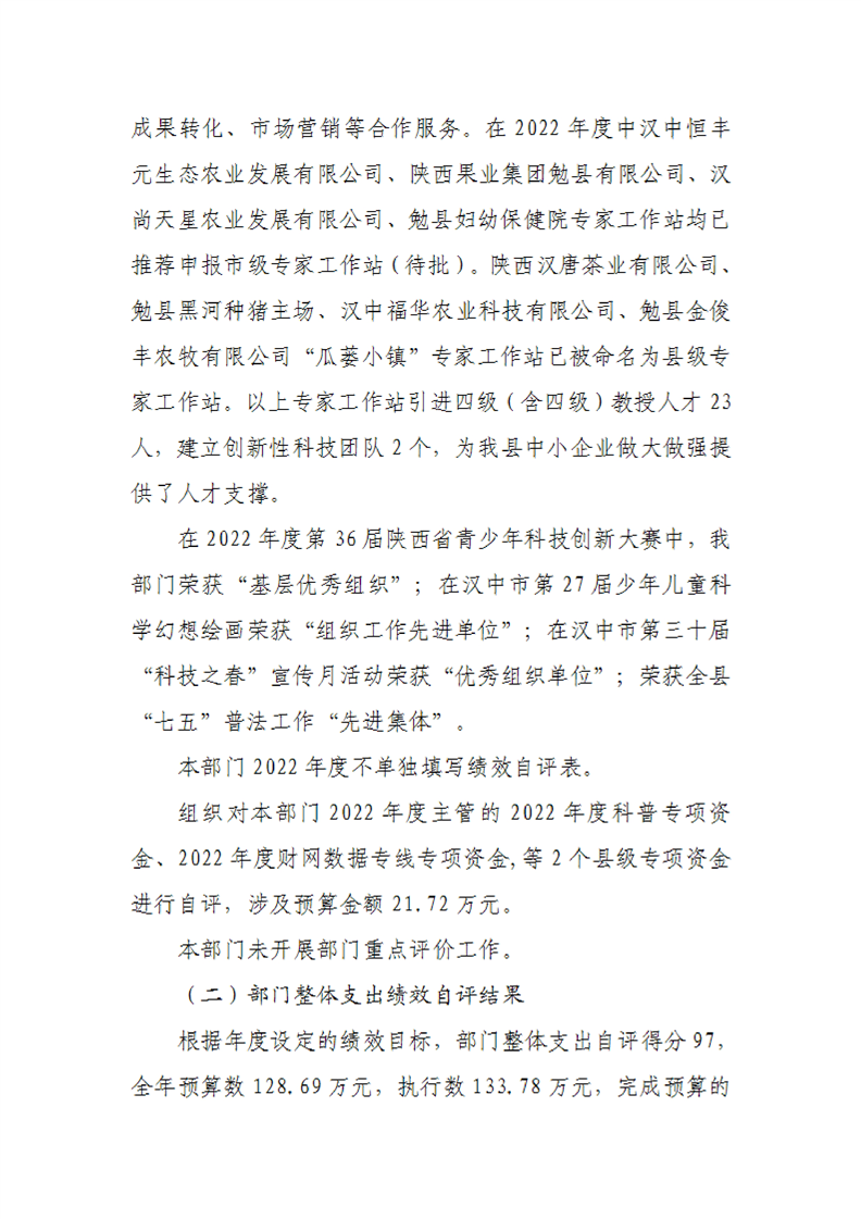 勉县科学技术协会2022年度部门决算公开