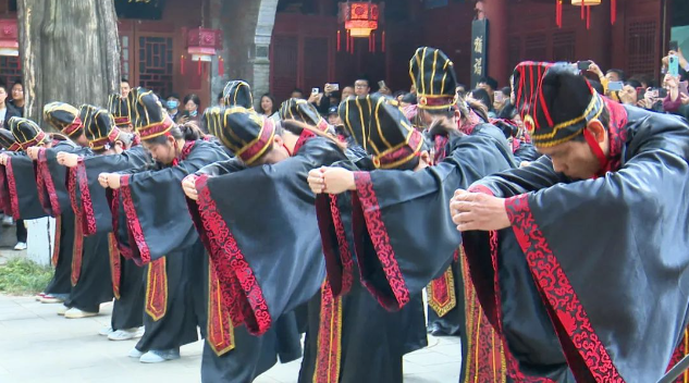 上午10时,武侯墓景区内庄严肃穆、雅乐悠扬。在武侯墓前千年汉柏的苍翠掩映中,承祭官、陪祭官、司香官等入主祭区行叩首礼、诵读祭文。典礼后,游客纷纷以赠送鲜花、书写寄语等形式表达对一代贤相诸葛亮的深切追思。