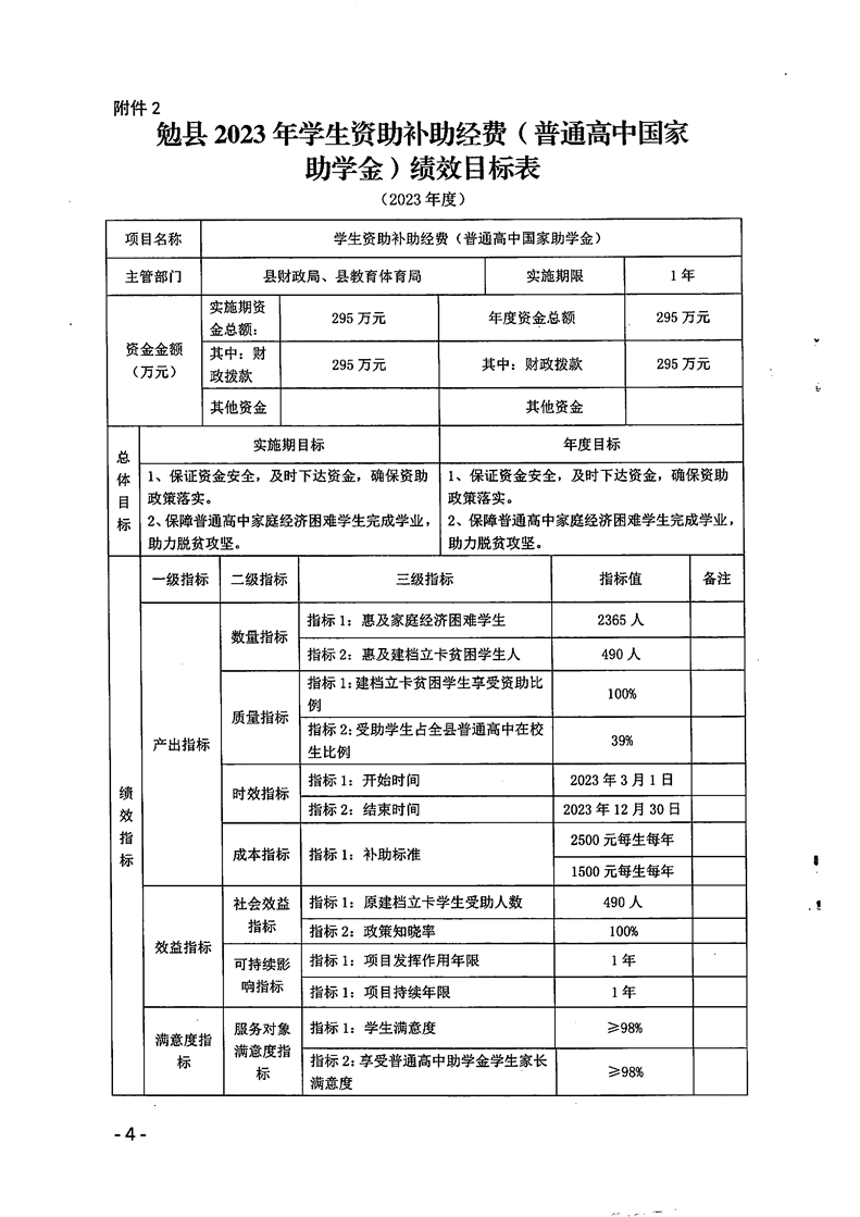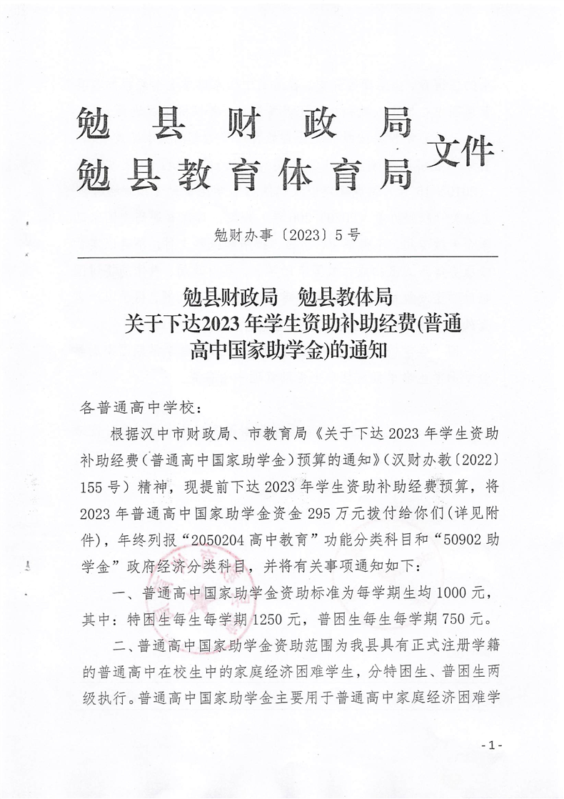 勉财办事[2023]5号 勉县财政局 勉县教体局关于下达2023年学生资助补助经费(普通高中国家助学金)的通知