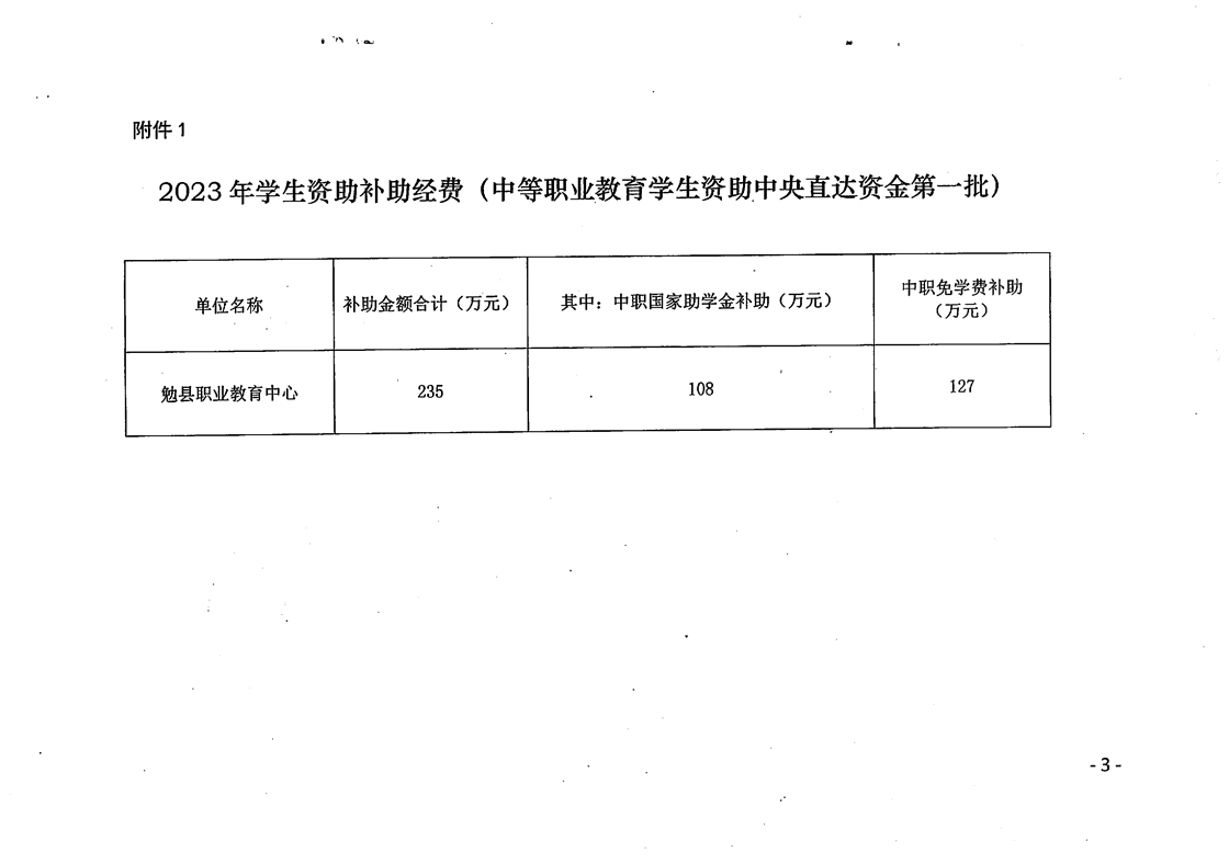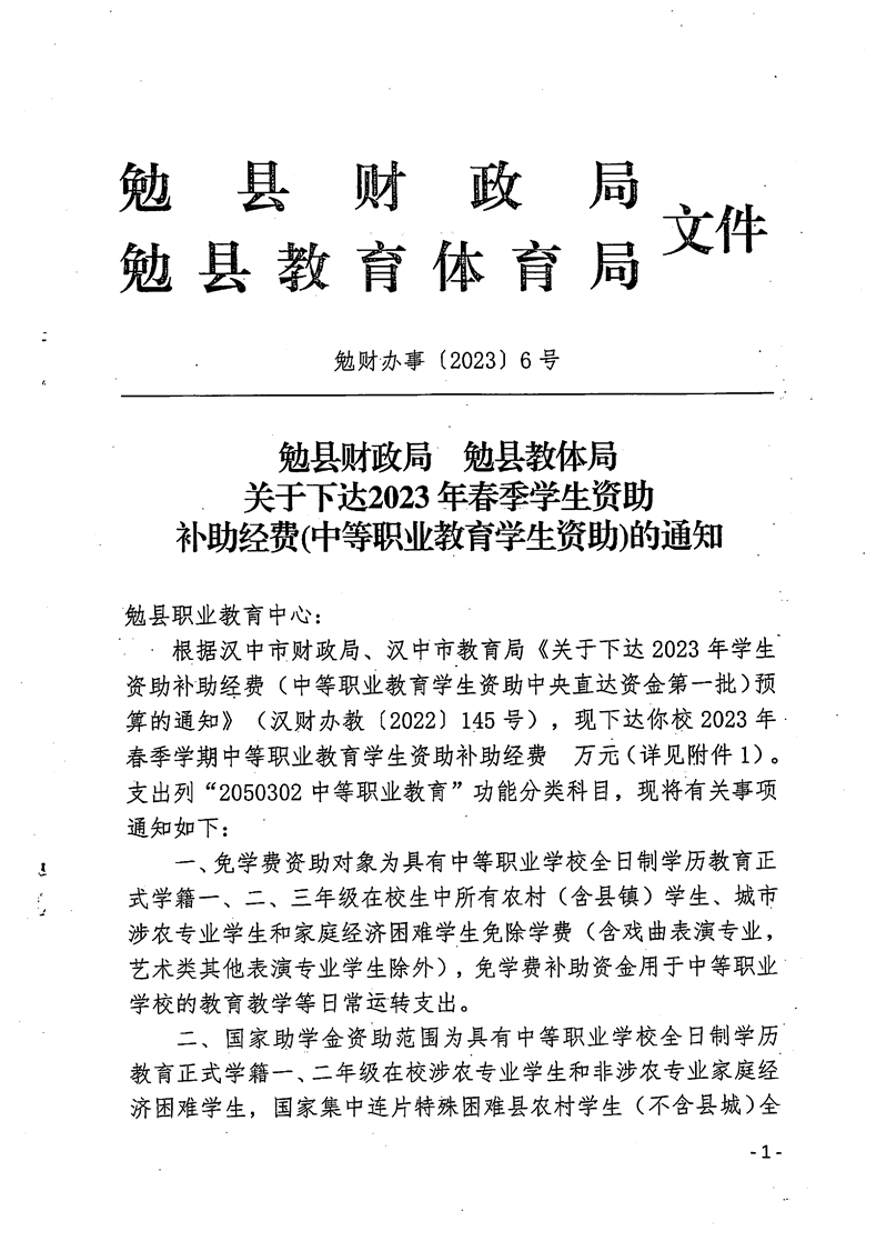 勉财办事[2023]6号 勉县财政局 勉县教体局关于下达2023年春季学生资助补助经费(中等职业教育学生资助)的通知