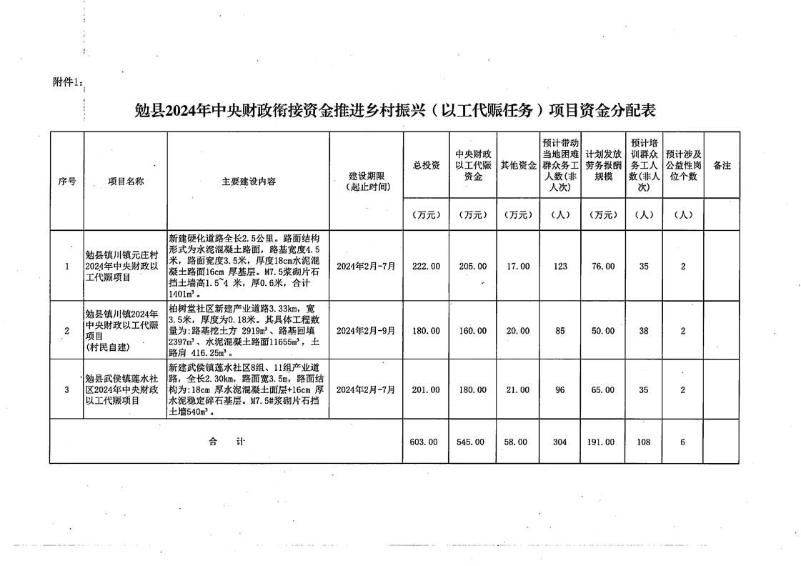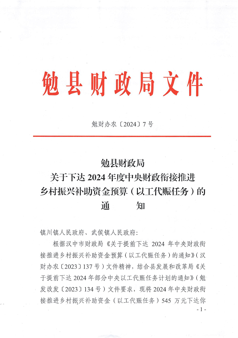 勉财办农〔2024〕7号 勉县财政局关于下达2024年度中央财政衔接推进乡村振兴补助资金预算(以工代赈任务)的通知