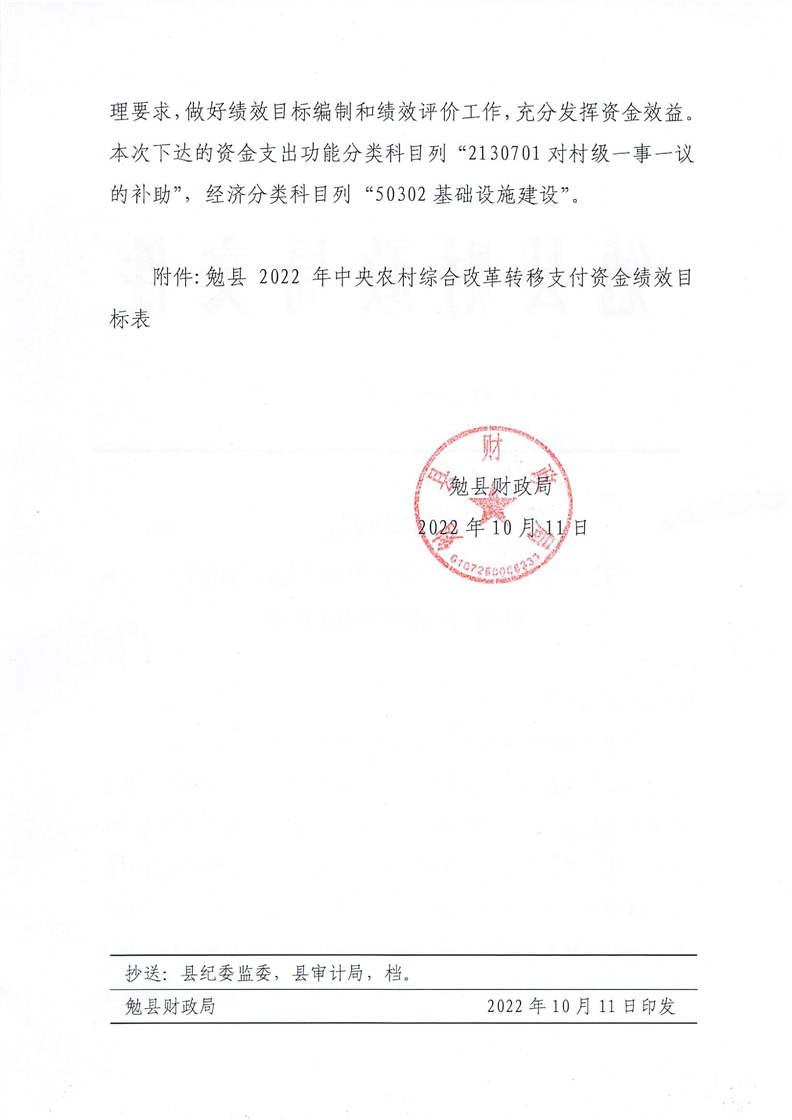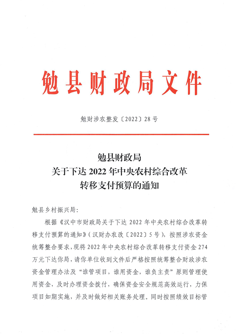 勉财涉农整发【2022】28号勉县财政局关于下达2022年中央农村综合改革转移支付预算的通知