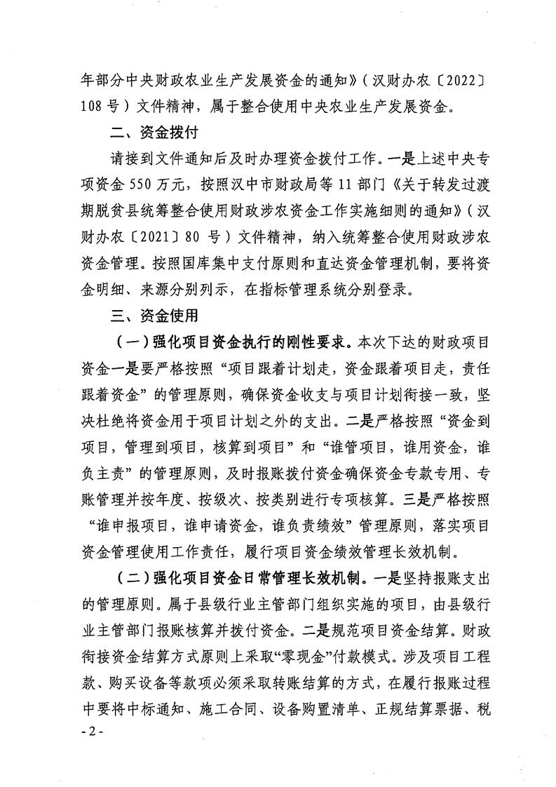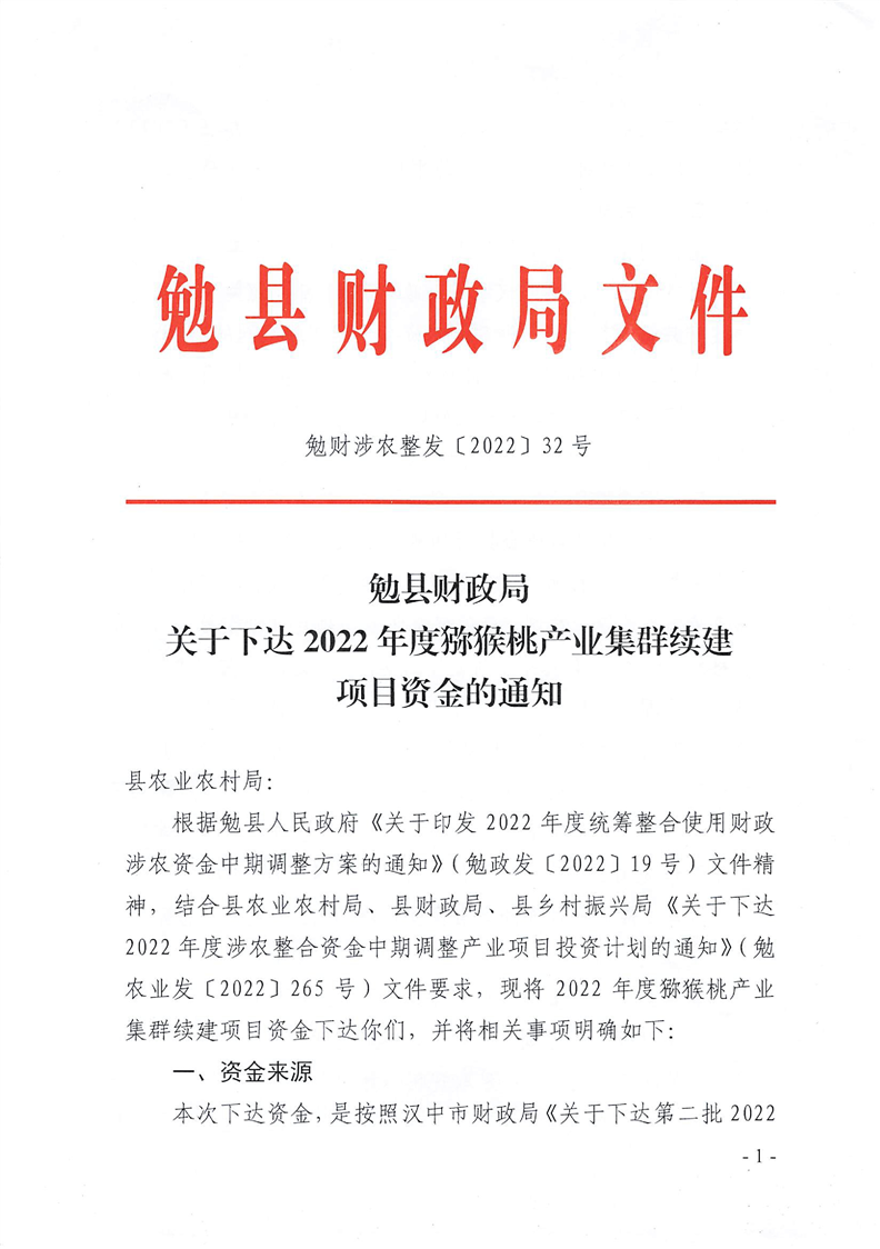 勉财涉农整发【2022】32号 关于下达2022年度猕猴桃产业集群续建项目资金的通知(县级文件)