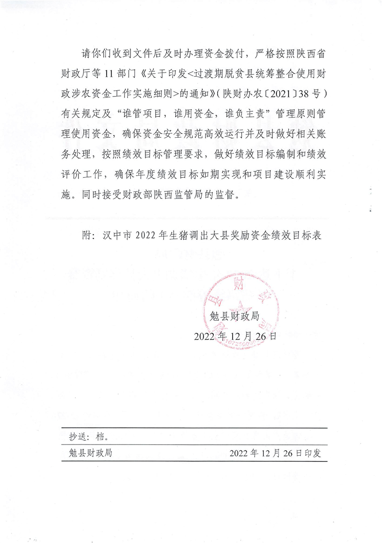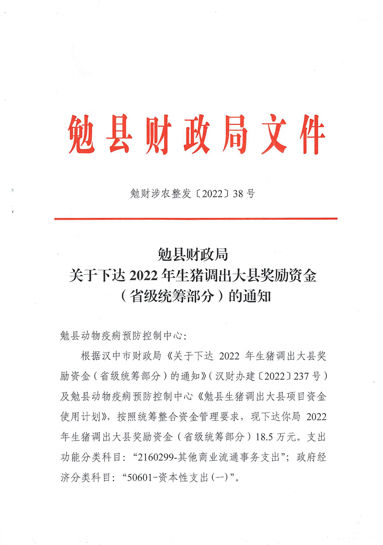 勉财涉农整发[2022]38号 关于下达2022年生猪调出大县奖励资金(省级统筹部分)的通知