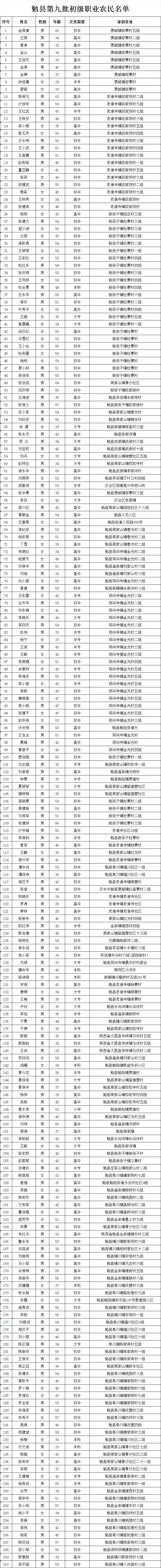根据勉县初级职业农民资格认定与管理办法,经过教育培训、个人申请、资格考核,拟认定金保建、王琪等210人为勉县初级职业农民(名单附后)。