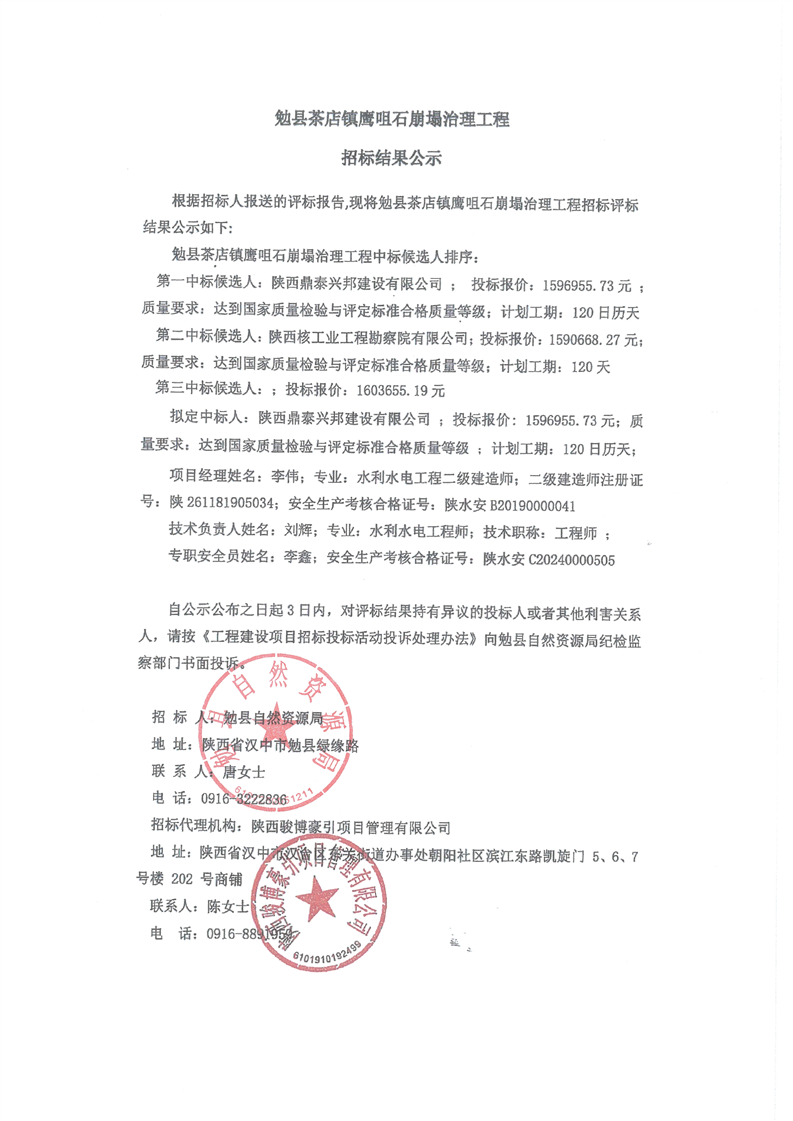 勉县茶店镇鹰咀石崩塌治理工程招标结果公示