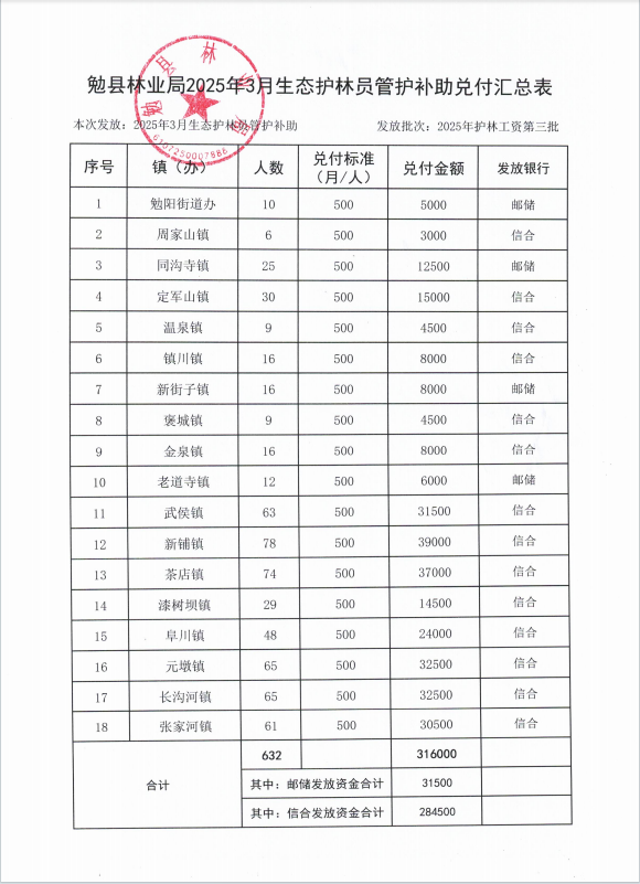 勉县林业局2025年3月生态护林员管护补助发放公示