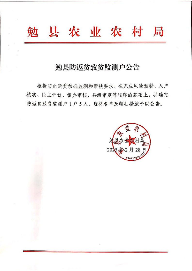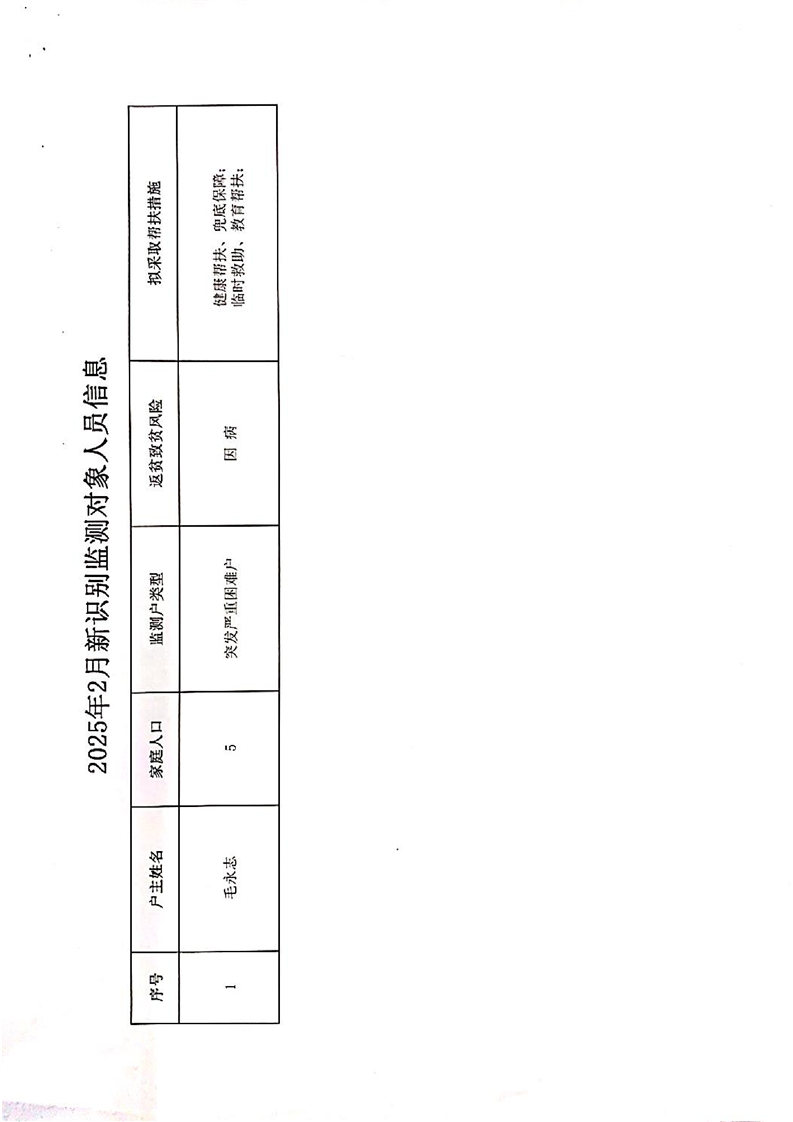 勉县防返贫致贫监测户公告1户5人