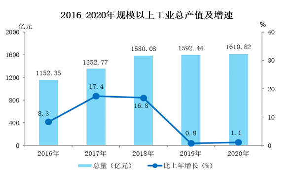 规模以上工业完成总产值1610.82亿元,比上年增长1.1%。其中,轻工业完成产值492.61亿元,下降3.5%;重工业完成产值1118.21亿元,增长3.3%。全部工业增加值494.18亿元,下降0.8%,其中规模以上工业增加值下降1.0%。