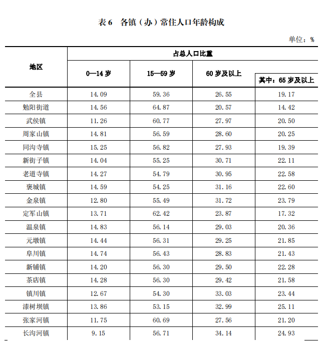 18个镇(办)中,15-59岁人口比重在60%-65%之间的镇(办)有4个,在60%以下的镇有14个。