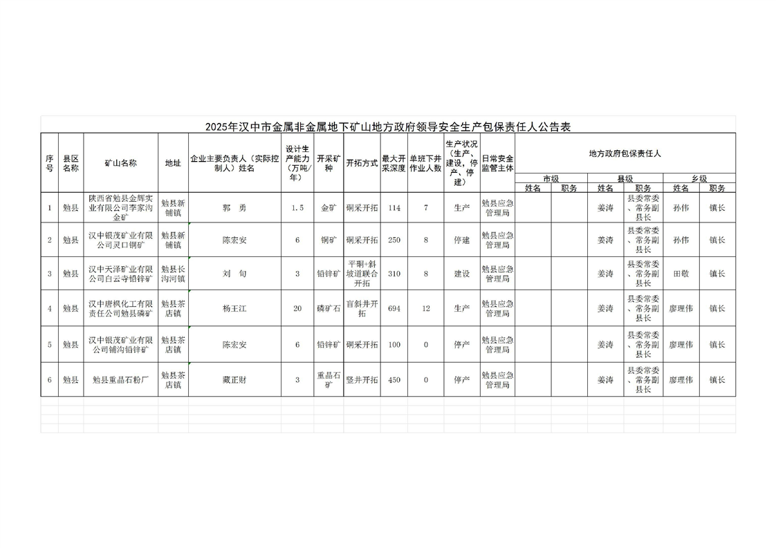 金属非金属地下矿山地方政府领导安全生产包保责任人公告表