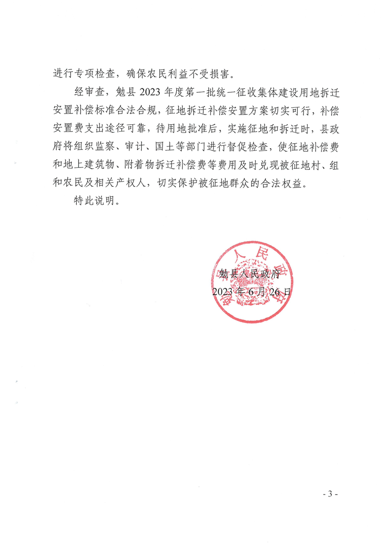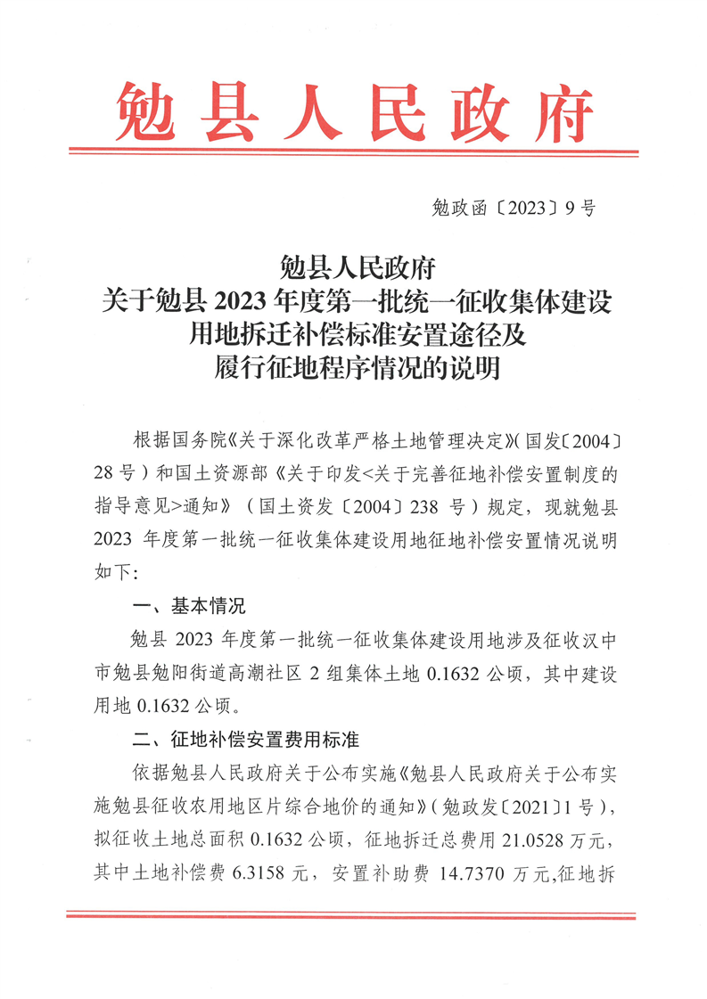 关于勉县2023年度第一批统一征收集体建设用地拆迁补偿标准安置途径及履行征地程序情况的说明