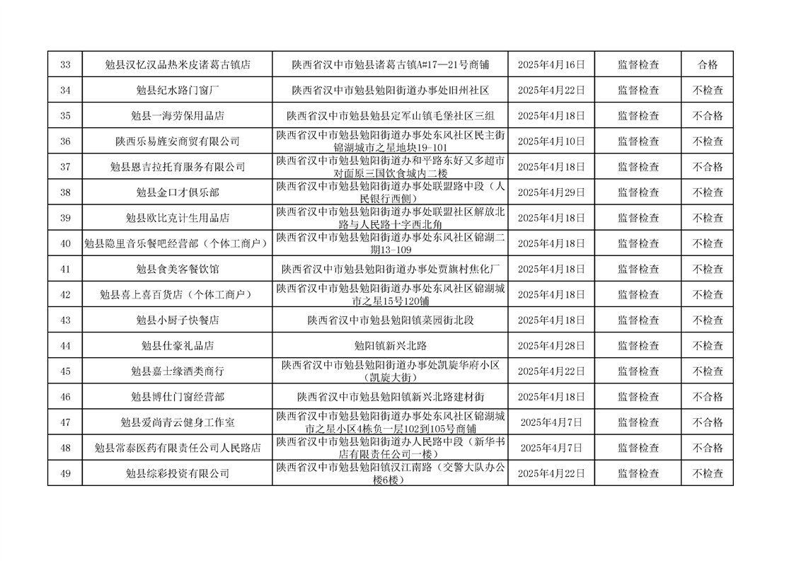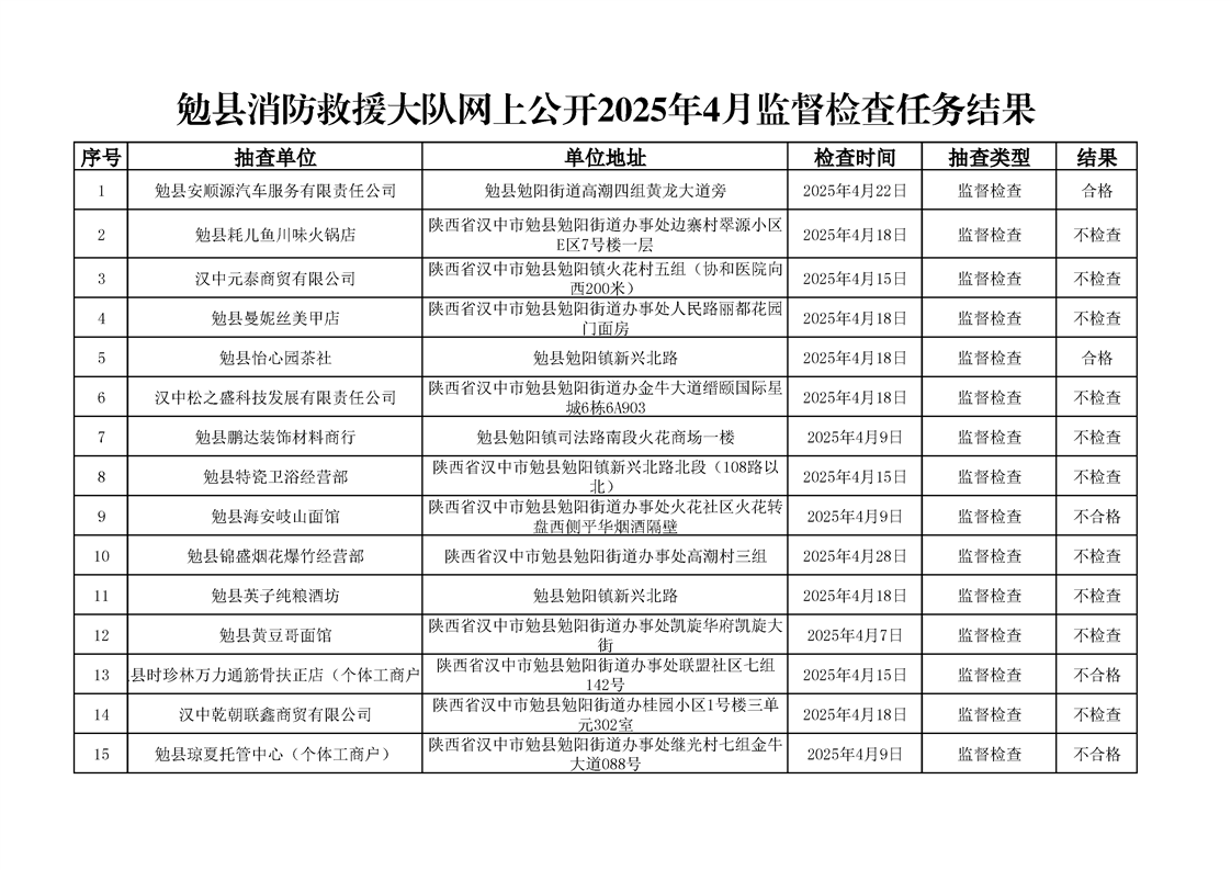 勉县消防救援大队网上公开2025年4月监督检查任务结果