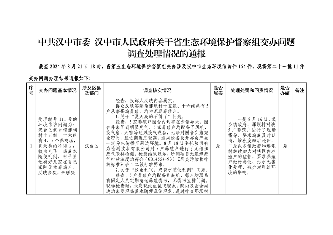 中共汉中市委 汉中市人民政府关于省生态环境保护督察组交办问题调查处理情况的通报(第二十一批11件)