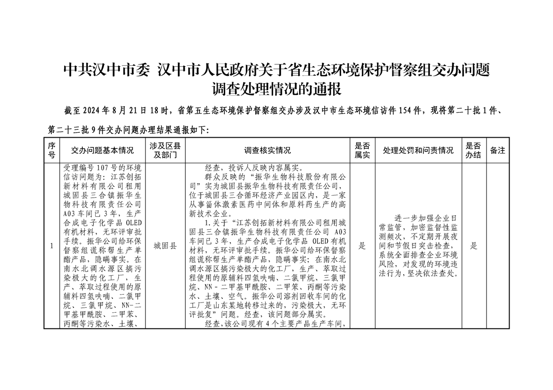 中共汉中市委 汉中市人民政府关于省生态环境保护督察组交办问题调查处理情况的通报(第二十批1件、第二十三批9件)